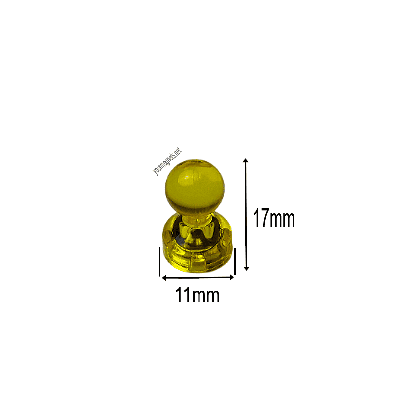 These yellow transparent cone magnets combine modern design with strong magnetic performance. Each magnet measures 11 mm in diameter and 17 mm in height, featuring a nickel-plated neodymium core that can securely hold up to 5 sheets of A4 paper on magnetic surfaces.